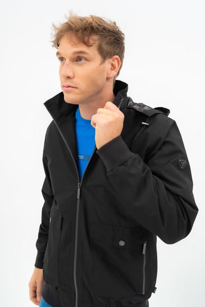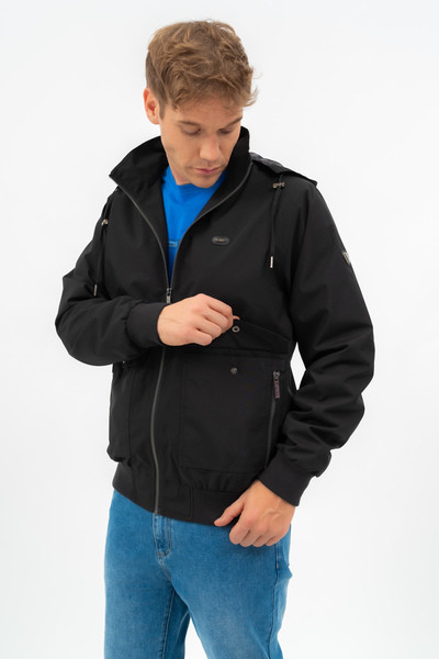 Férfi dzseki . Kapucni a gallérban. Belső zsebek. Fémcímkével díszítve.