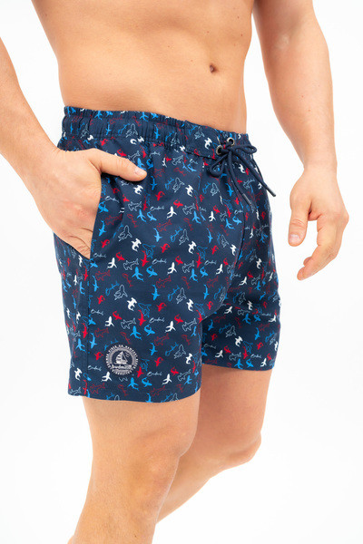 Férfi beach short . Hálós belső nadrággal . Nyomott mintával és/vagy szövött címkével díszítve. Mindkét oldalán zsebek. Hátul egyik oldalán tépőzáras zseb. A nadrág hátsó részén vízkivezető lyukak.