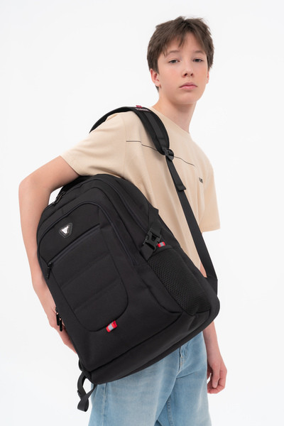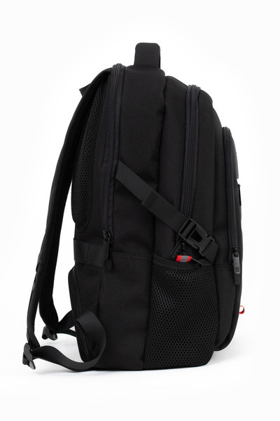34x46x22 cm, 0,68 kg. Alapanyaga vízlepergeto. Mindkét oldalán hálós zseb. Légcsatornás hátlap. Három különálló cipzáros rekesz. Az elso rekeszben rendszerezo zsebek. Boröndre rögzítheto. Laptoptartó: 26 X 33cm.