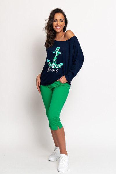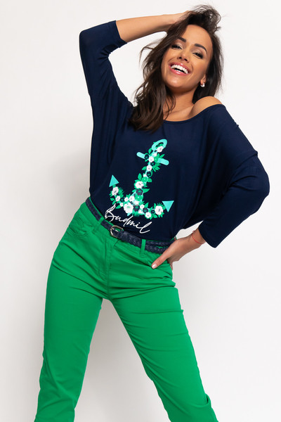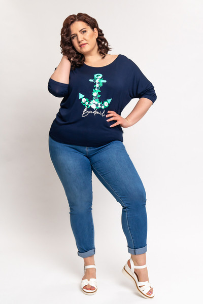 3/4-es ujjú női felső. Lezser fazon. Nyomott mintával díszített.