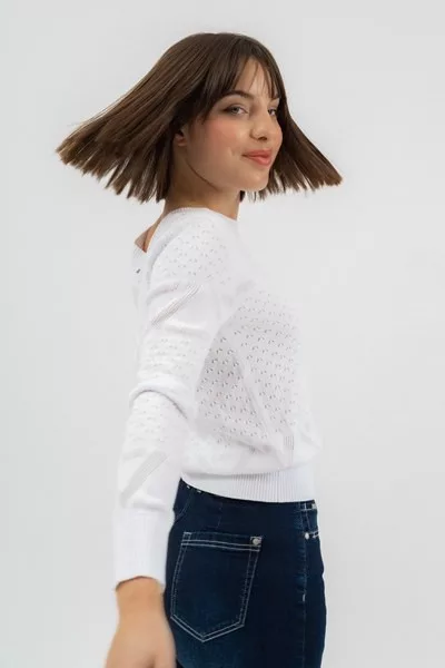 női vékony kötött pulóverrövid, lezser fazon - fémcímkékkel díszítve<br> <br><p>Ez a <strong>női vékony kötött pulóver</strong> könnyed viseletet biztosít a mindennapokra. A <strong>rövid, lezser fazon</strong> kényelmes illeszkedést és modern megjelenést ad, amely jól kombinálható különböző alsókkal. A modellt visszafogott <strong>fémcímkés díszítés</strong> egészíti ki, amely egységes, letisztult összhatást teremt.</p>