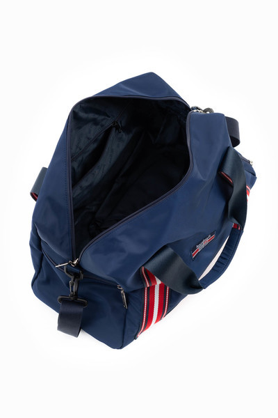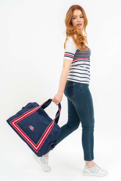 45X28X20 CM. Női textil sporttáska, utazótáska . Anyaga vízlepergető . Cipzáras zsebekkel . állítható, leszedhető vállpánttal . Szövött címkével díszítve.