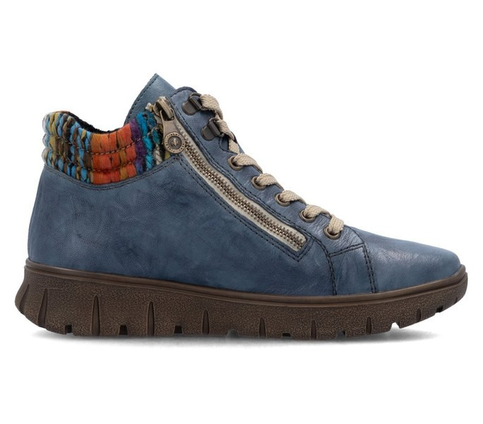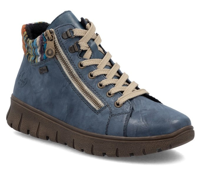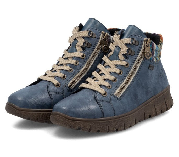 Kék színű Rieker N1305-14 női bakancs. Felsőrészének az anyaga: bőr felső