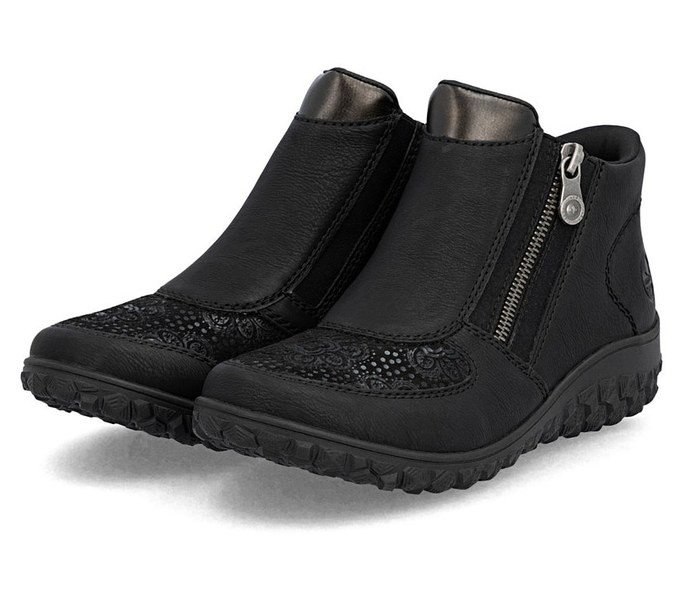 Fekete színű Rieker 59558-00 női bokacsizma. Felsőrészének az anyaga: Ekológikus bőr/textil felső