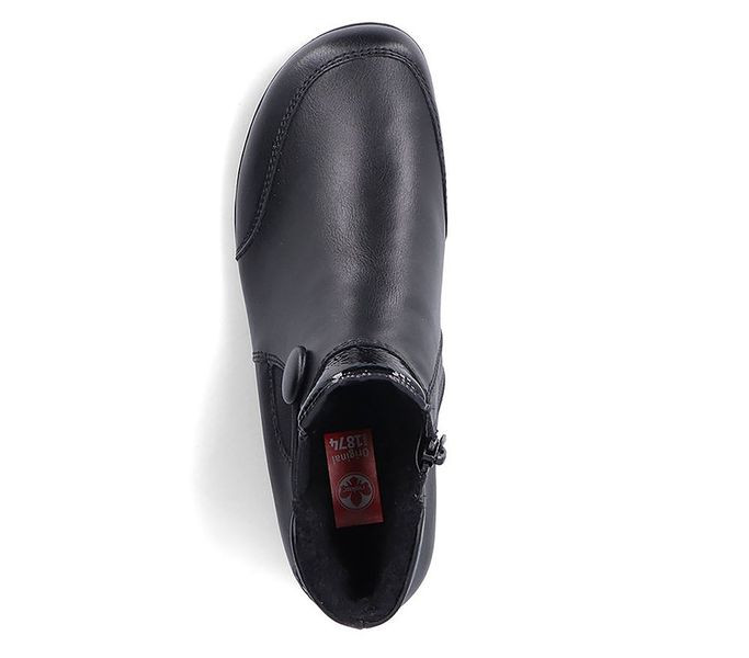 Fekete színű Rieker L4665-00 női bokacsizma. Felsőrészének az anyaga: műbőr felső