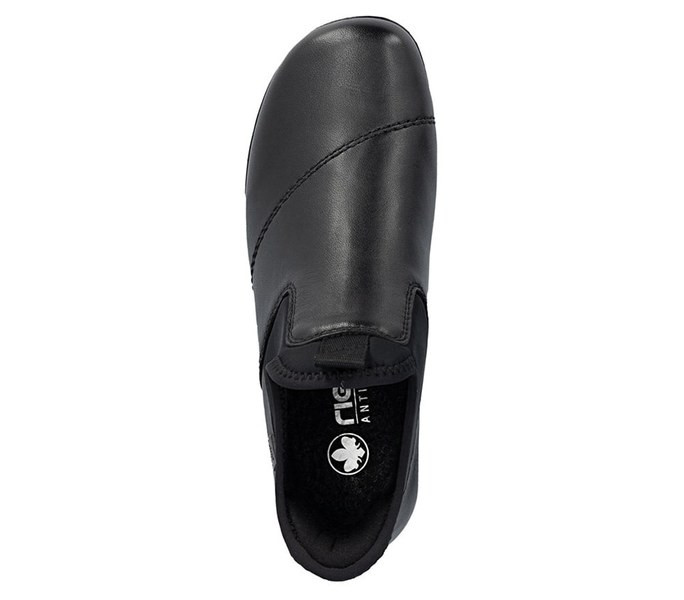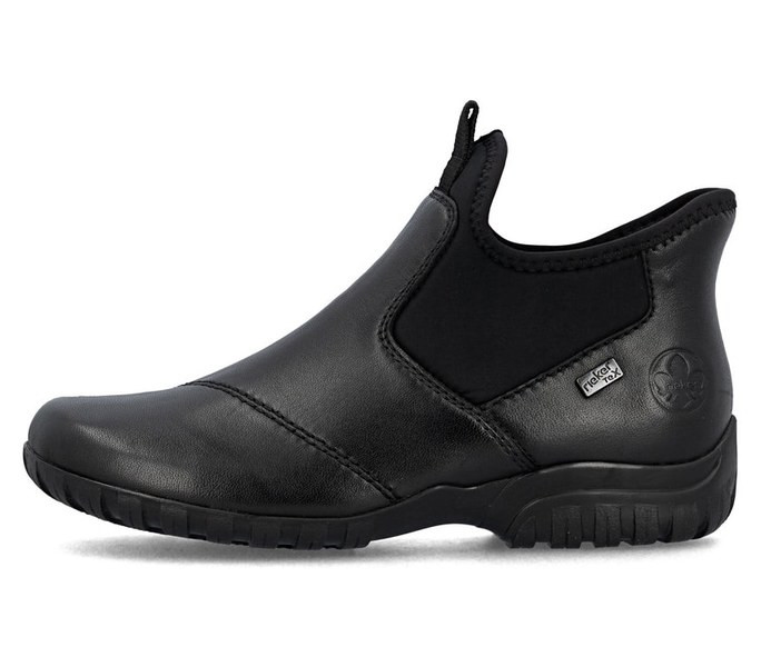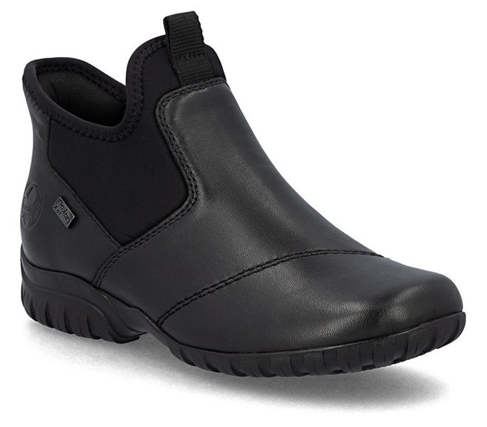 Fekete színű Rieker L4677-00 női bokacsizma. Felsőrészének az anyaga: bőr felső/textil