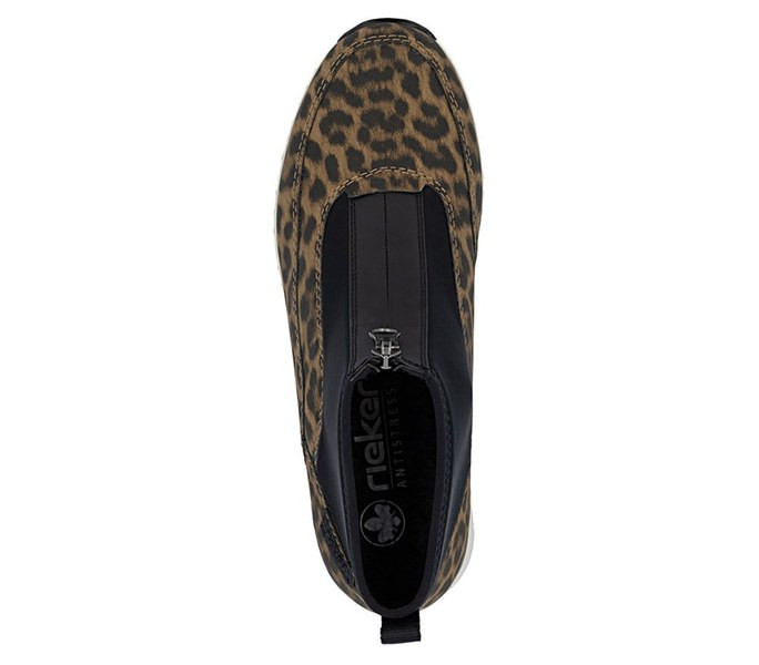 Barna színű Rieker N6352-90 női bokacsizma. Felsőrészének az anyaga: Ekológikus/textil felső