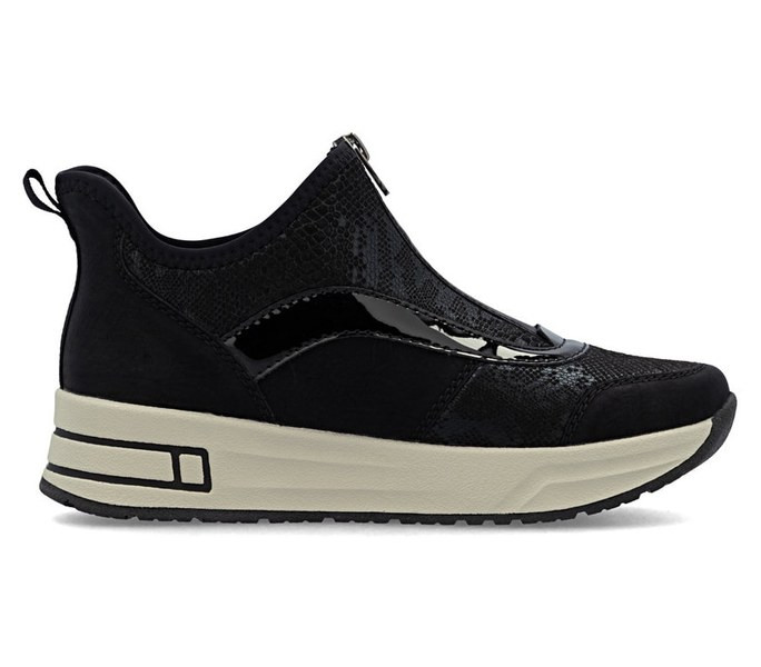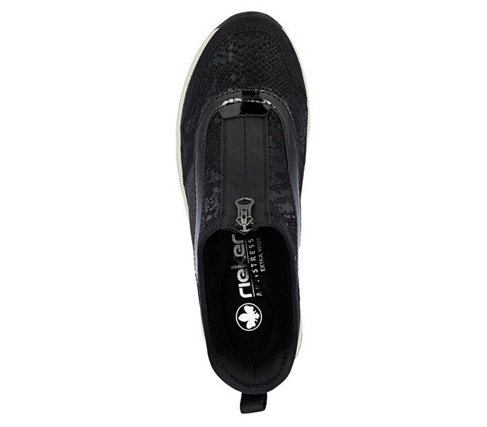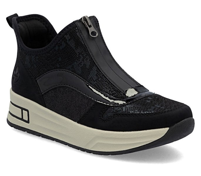Fekete színű Rieker N8151-00 női bokacsizma. Felsőrészének az anyaga: Szintetikus felső